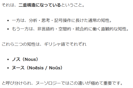 ここには書かれていない「ノウス」もヌーソロジーの独自用語としてあるが、こっちはギリシャ語のヌースに近いということでヌースとして説明されている。