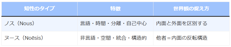 そのため、その基本だと「自己側=ヌース」「他者側=ノス」のようになるため、ノスの説明で自己という言葉を使うとややこしくなってしまう。