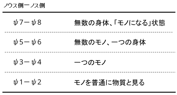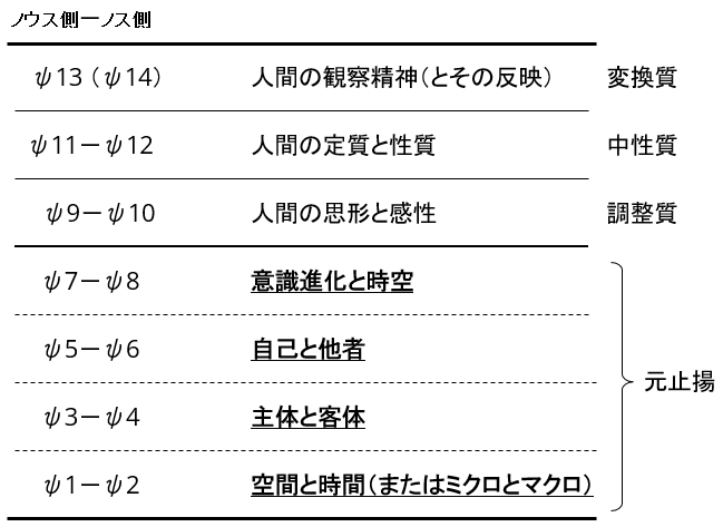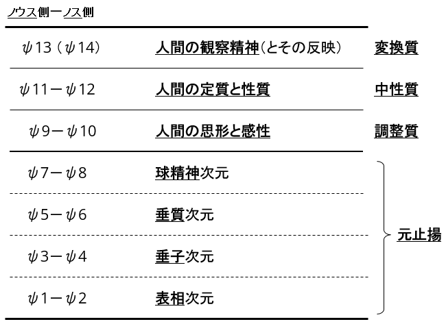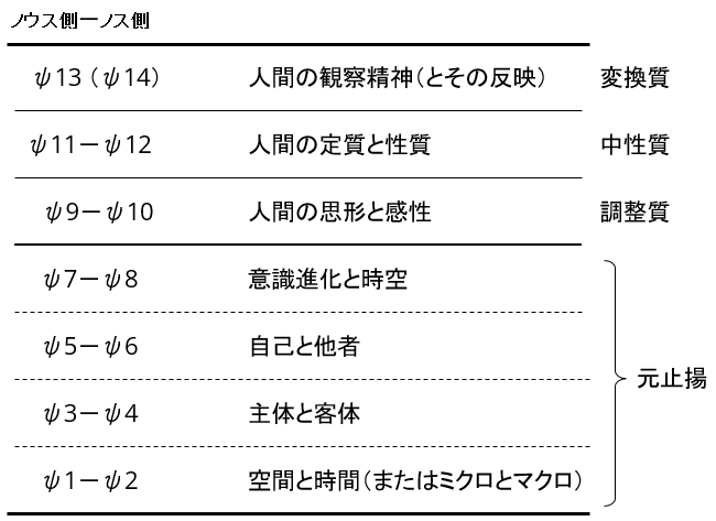 ψ9は偶数系の元止揚に被さる所に位置し、ψ10は奇数系の元止揚に被さる所に位置するようになるため、本来、ψ9はψ7とψ8を『等化』するためノウス(NOOS)側だが、人間にとってはノス(NOS)として機能するようになったりと、色々とややこしくなってくる。