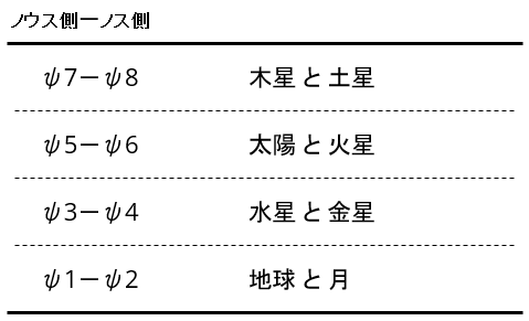 正確には、ψ3の上位に水星がある、ψ5の上位に太陽がある・・・といったイメージのが近いのだが、そのそれぞれを紐づけて考えていくと分かりやすいのでここではその方針で行く。