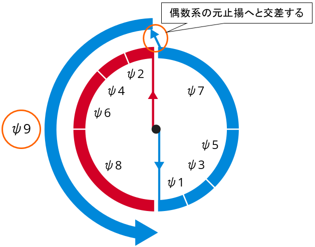 ケイブコンパスの図で説明すると、ψ1〜ψ8の次を進むと、今度は奇数系の元止揚が偶数系の元止揚へと交差するようになる。