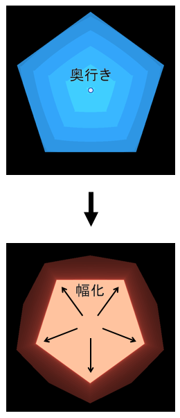 正十二面体にある五角形の広がりは、奥行きである正二十面体の頂点が幅化したものみたいに捉えると分かりやすいと思います。
