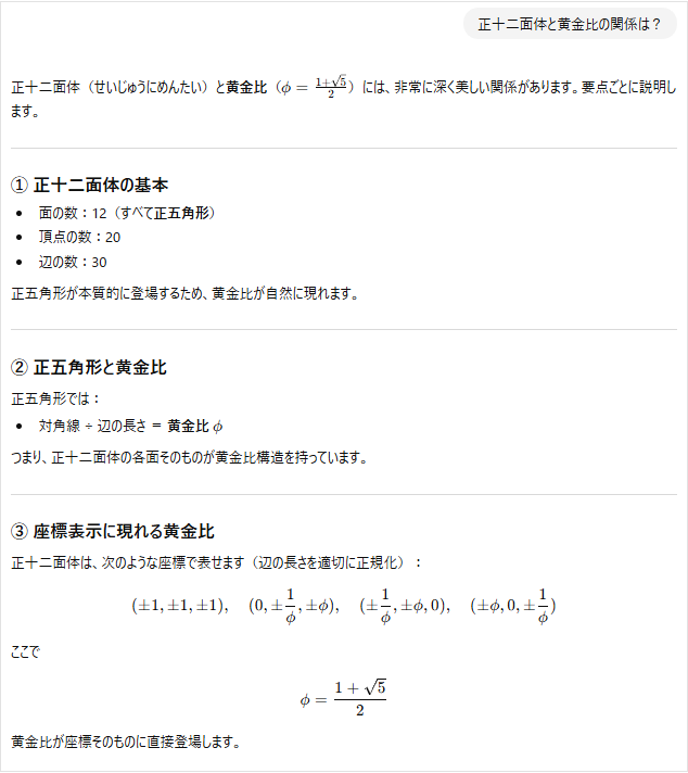 正十二面体や正二十面体と黄金比の関係については、調べればすぐに分かります。